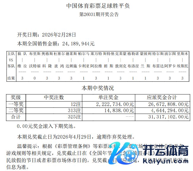 北京时辰2月28日,输赢彩第26031期开奖效果揭晓。本期足彩头奖共开出12注,单注奖金2,222,734元,1583万滚存被清空;二等奖开出313注14,838元;任九开1153注8501元。本期足彩销量为24,189,944元,任九投注总和为15,315,116元。