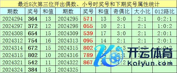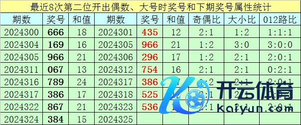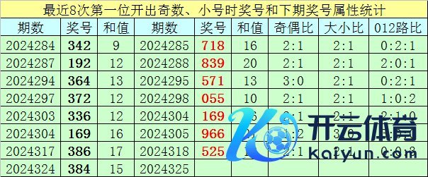 上期转头:福彩3D第2024324期开出奖号为384,奖号奇偶比为1:2,大小比为1:2,012路比1:1:1。
