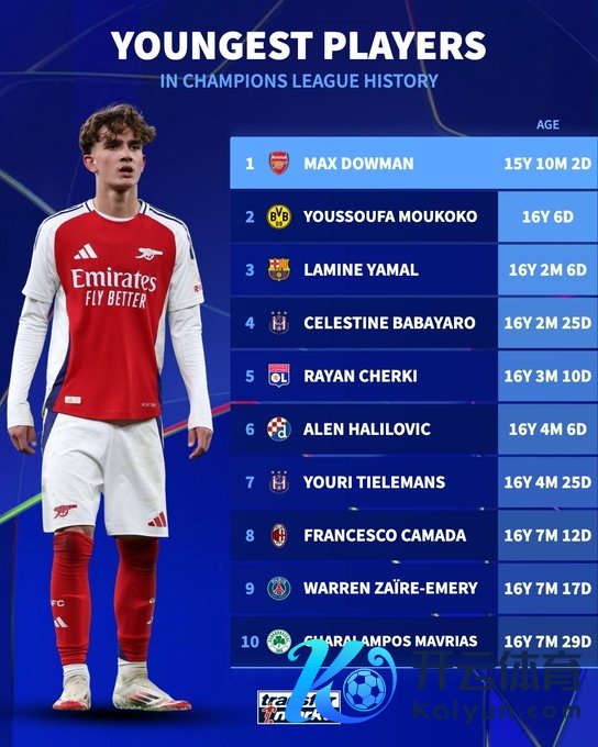 11月5日讯 欧冠联赛阶段第4轮比赛,阿森纳在客场以3-0的比分完胜布拉格斯拉维亚。本场比赛,阿森纳15岁小将说念曼替补登场成欧冠历史出场最年青球员。
