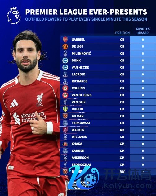 以下为本赛季于今保执全勤的英超非门将球员名单:
