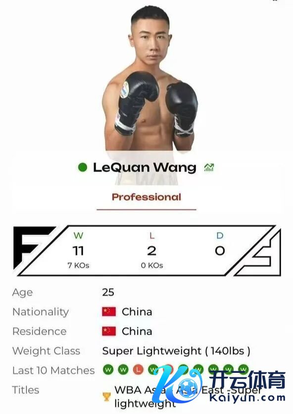 现年26岁的王乐泉是比年来中国拳坛上涨势头最迅猛的重生代拳手之一,他诞生于江苏徐州丰县,身高和臂展均为1米73,主打140磅。外形俊朗的王乐泉虽莫得业余拳击基础,但从9岁运转习武,擅长拳法、形意拳及实战散打。2018年,王乐泉慕名单身前去昆明名东谈主堂拳馆,跟著名讲明注解林国伟和前WBA/WBC亚洲羽量级拳王韦宪钱从零基础运转学习拳击。自2019年步入功绩拳坛于今获取了13战11胜7场KO敌手的功绩战绩。