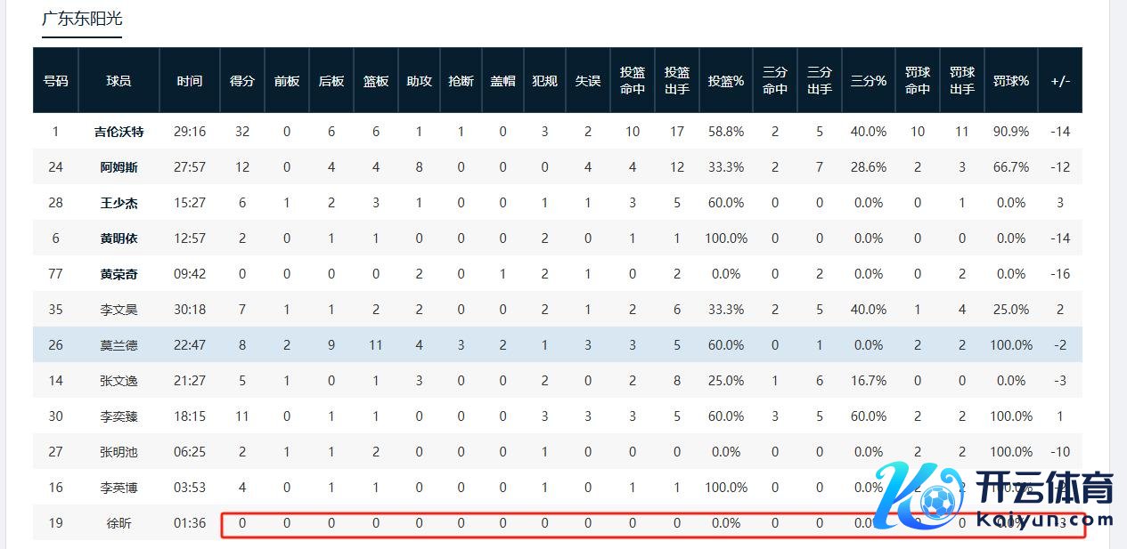 徐昕本场比赛出场1分36秒,统共19项技能统计有18项是0,独一不是0的是正负值,本场徐昕的正负值为负3,也便是说在徐昕登场的这段时期广东宏远又多输了3分。