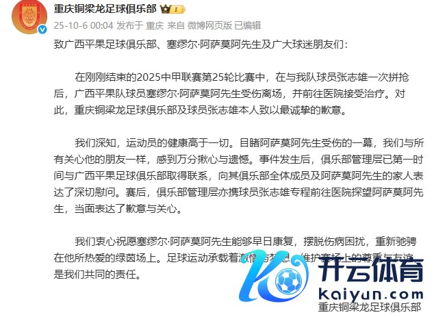 在刚刚放置的2025中甲联赛第25轮比赛中,在与我队球员张志雄一次拼抢后,广西平果队球员塞缪尔·阿萨莫阿先生受伤离场,并赶赴病院接纳协调。对此,重庆铜梁龙足球俱乐部及球员张志雄本东说念主致以最诚恳的歉意。