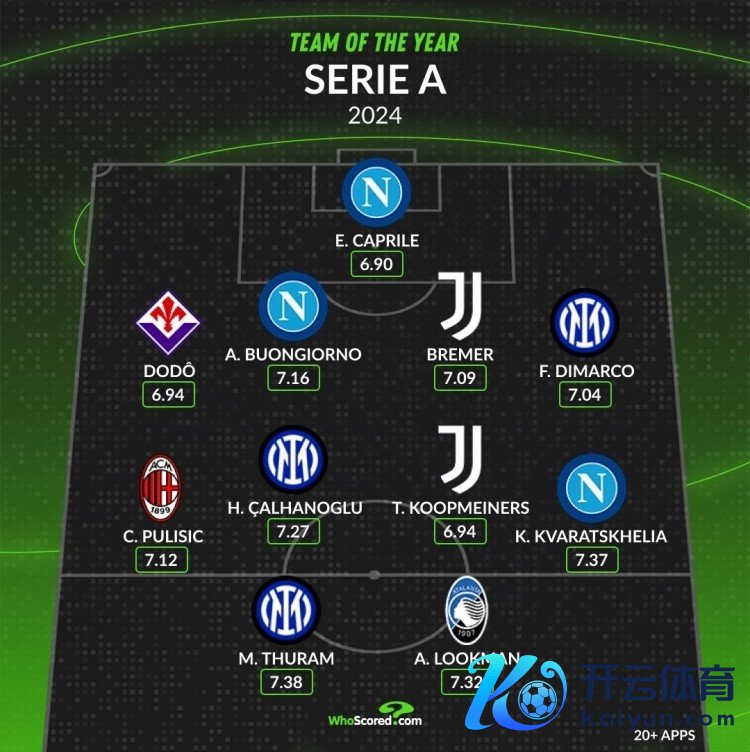 WhoScored证明球员的场均评分列出了2024年意甲最好声威,小图拉姆、恰尔汗奥卢、普利西奇、克瓦拉茨赫利亚在列,国米、那不勒斯各三名球员入选的。