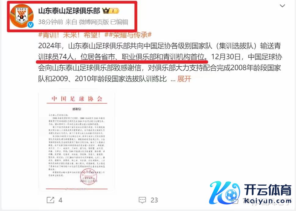 如今,泰山队的青训体系还是成为中国足球界的一面旗子,就在近日,中国足协还特意发布公告感谢了泰山队,因为在2024年,泰山足球俱乐部共向中国足协各级异国度队运送了74名球员,这一数字位居各省市、办事俱乐部和青训机构之首。这充分讲明了泰山队在青训方面的干预和效率体育录像/图片,也为中国足球的将来培养了更多的东谈主才,这应该是对泰山队坚捏青训最佳的细则了。