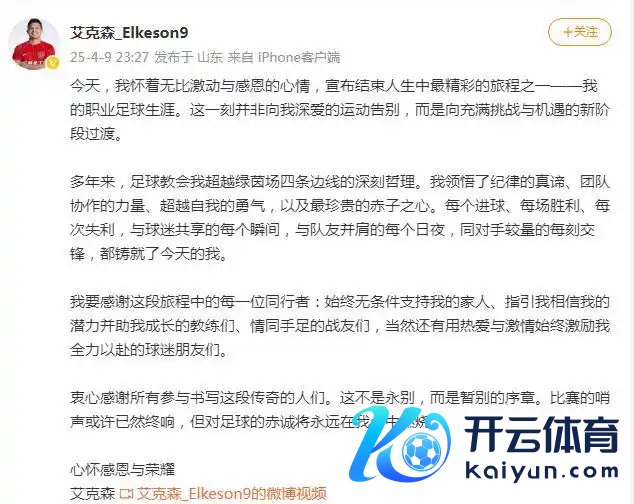 4月9日,国足首位非血缘归化国脚艾克森在个东说念主外交平台上发文,通知退役。“今天,怀着满心的感动与谢忱,我通知放置我性掷中最不成念念议的一段旅程:我的行状足球融会员活命。此刻并非告别我所疼爱的这项融会,而是迈向一个充满挑战与机遇的新阶段。”