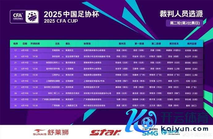 4月19日讯 中国足协杯官方公布第二轮第2比赛日裁判安排,张超法则无锡吴钩vs南通支云,郭翔法则深圳二零二八vs陕西集结,马腾法则广州蒲公英vs南京城市。