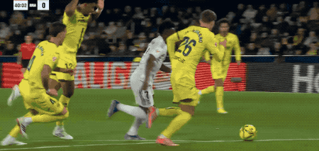 第40分钟,皇马前场积极逼抢,贝林厄姆断球,维尼修斯的斜射稍许偏出。
