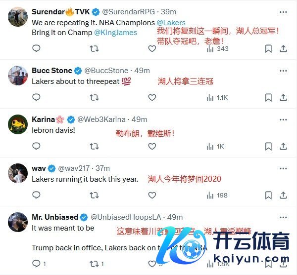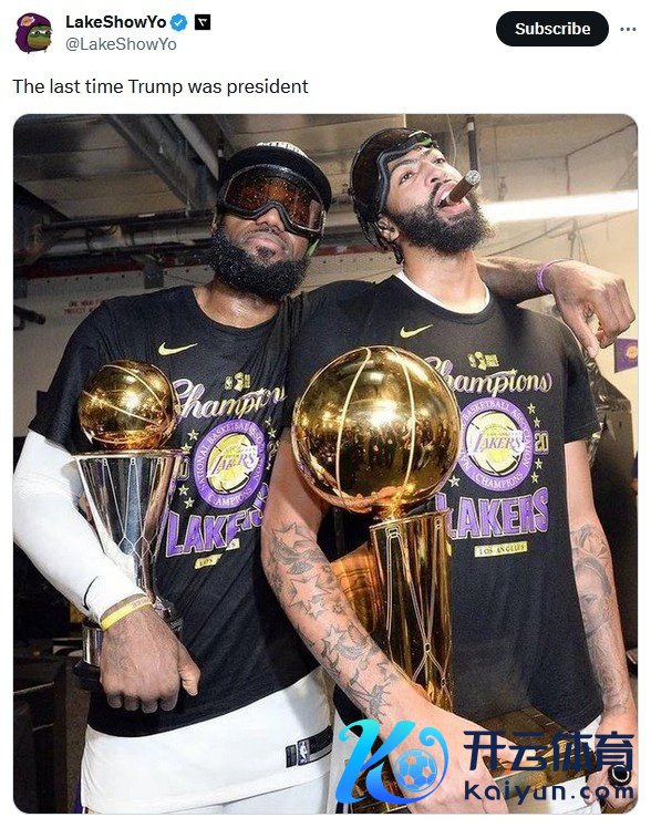 湖东谈主自媒体@LakeShowYo晒出詹眉夺冠时捧杯庆祝的像片,并写谈:“上一次川普在位时刻发生的事。”