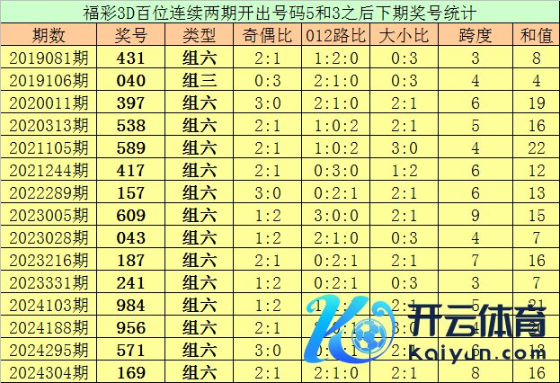 百位号码:联络两期百位出号别离为:5-3,历史上福彩3D联络两期前后别离出号5-3的奖号共出现79次。在百位5-3的奖号险恶出当前,近15期下期别离出号:431-040-397-538-589-417-157-609-043-187-241-984-956-571-169;