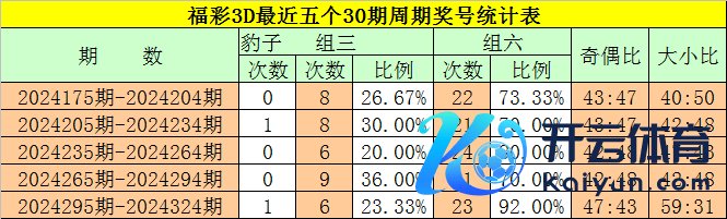 在最近一个30期周期内(第2024295期-第2024324期),组三(含豹子)号码共出现7期,占开奖总额的28%,组六奖号共出现23期,开出比例为92%,组六号码纠合出现4期,进展终点活跃,本期展望奖号为组六号码。