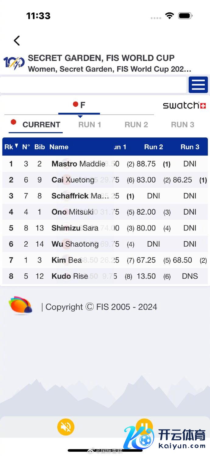 单板滑雪U型场面寰宇杯云顶站女子决赛松手,蔡雪桐在第一轮错误的情况下,后两轮抓续提高得回银牌。玛迪·马斯特罗得回冠军,另一位中国选手武绍桐排行第6。