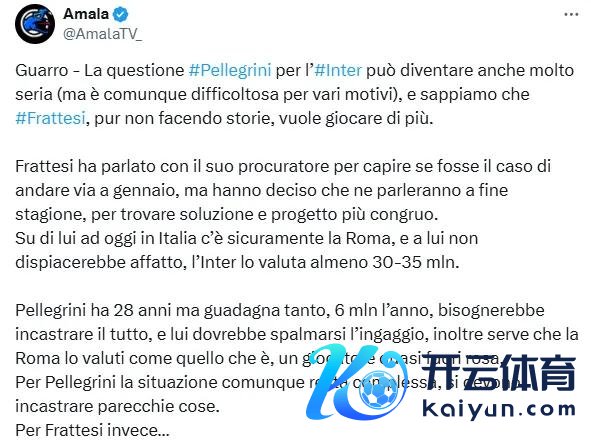 1、瓜罗——对于佩莱格里尼与海外米兰的问题可能会变得相配严肃(但由于种种原因仍然贫乏重重)。同期,咱们也知说念#弗拉西洋天然莫得闹情怀,但他确乎但愿有更多的上场时候。
