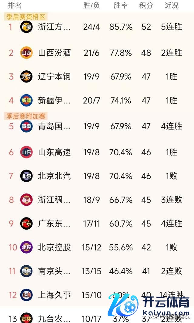 辽宁与新疆昨晚各自治服敌手,两队都是积分47分联袂重回四强,辽宁名顺序三新疆第四!但其实新疆亦然少赛一轮,后续补赛后积分也会累计追念。但疆辽重回四强亦然理由之中,毕竟两边是上赛季的总冠亚军,固然本赛季两队都资历主力伤病潮,且都没配王人四名外助,但毕竟强队底蕴还在!